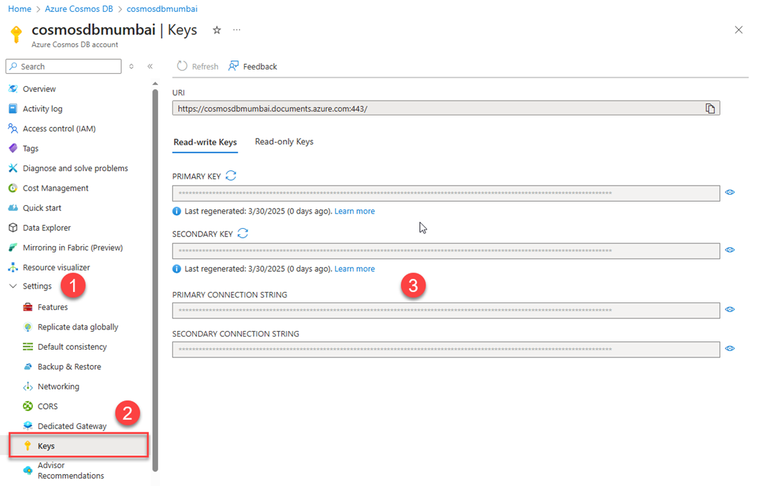 Click on cosmosdbmumbai to view details and Connection String to Connect. To view the Connection string click on Keys under settings then you will see the Primary and Secondary Connection string.