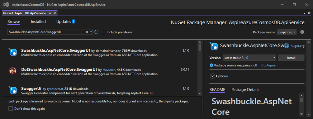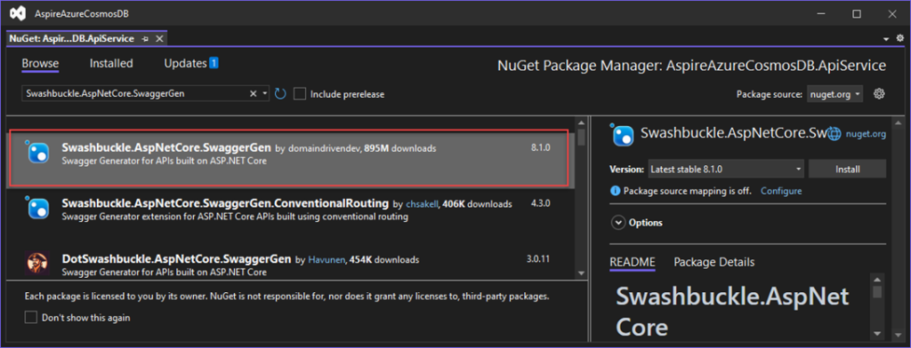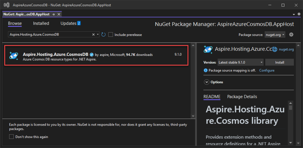 Let’s begin with adding the NuGet Package to AspireAppCos.AppHost Project.