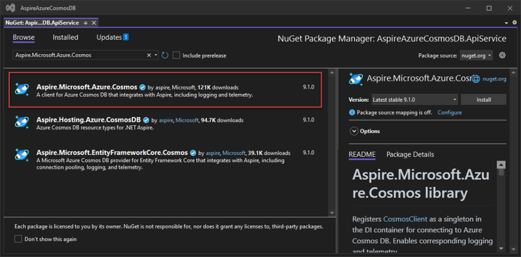 View after Adding Aspire.Hosting.Azure.CosmosDB NuGet packages to the project.