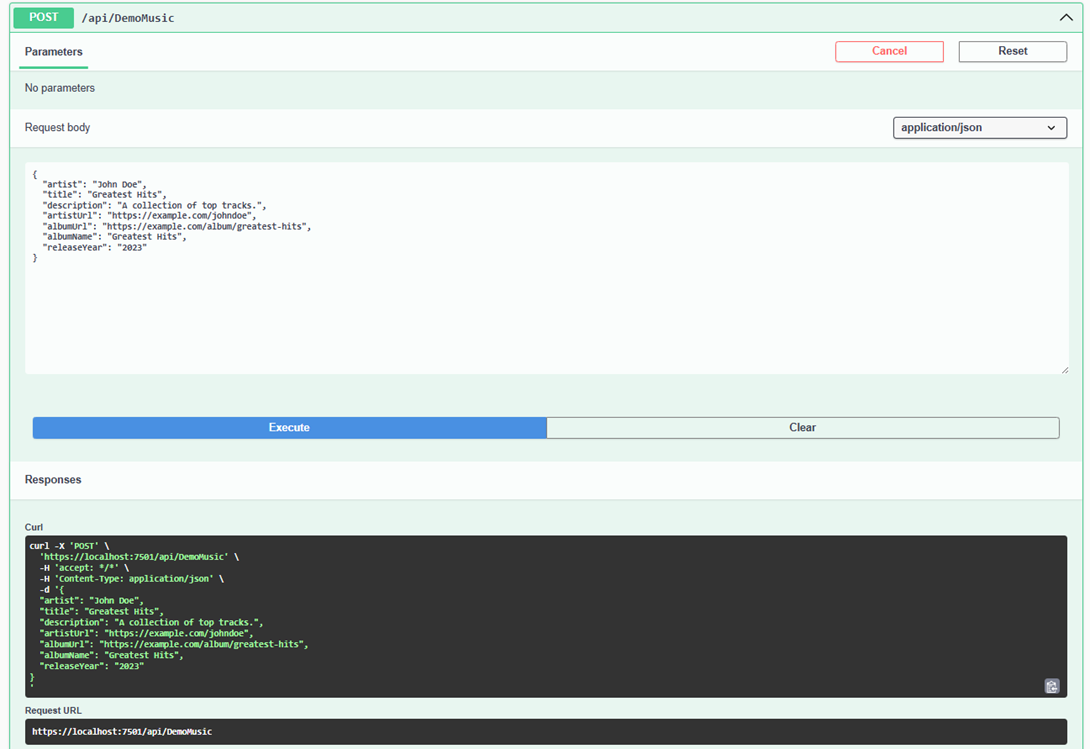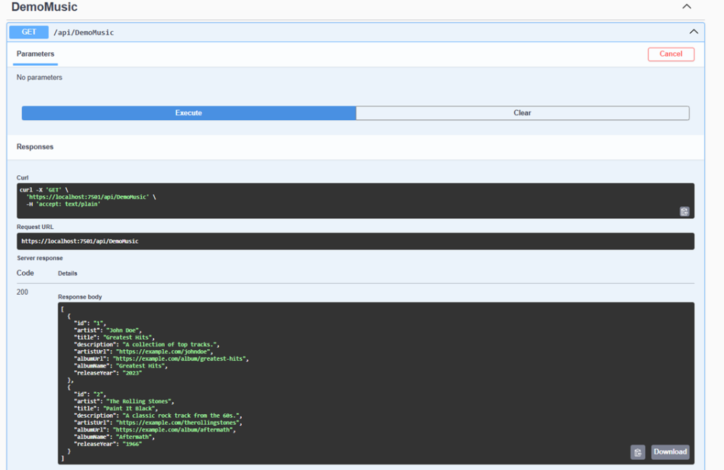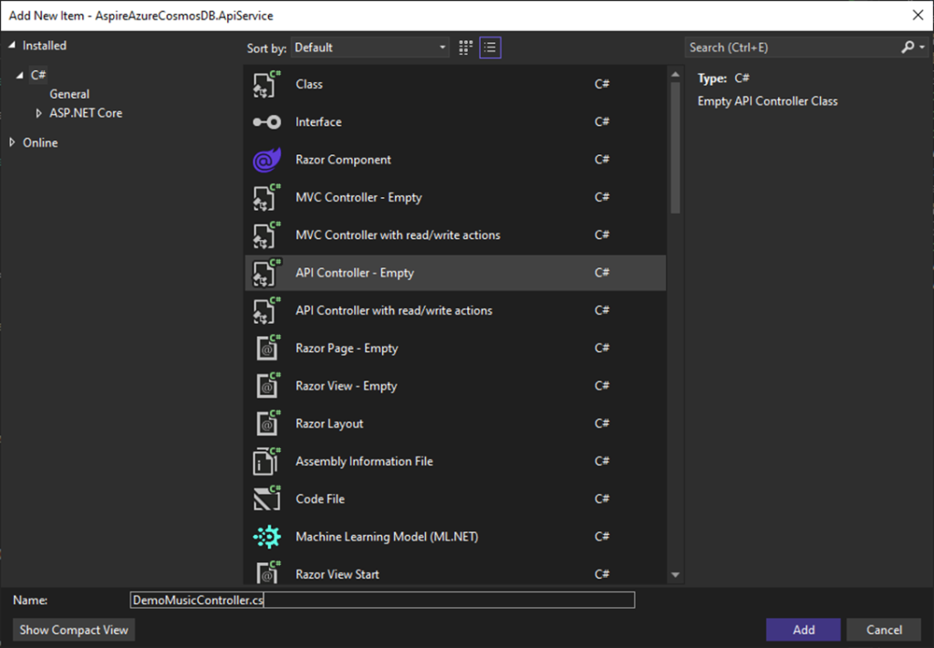 Let’s create a simple DemoMusicController to demonstrate API functionality. It will use the registered CosmosService for database interactions.