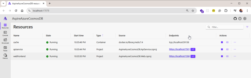 This is the Dashboard for Aspire project where you will see all applications which are running.