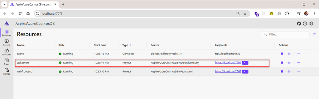 var apiService = builder.AddProject<Projects.AspireAzureCosmosDB_ApiService>("apiservice")