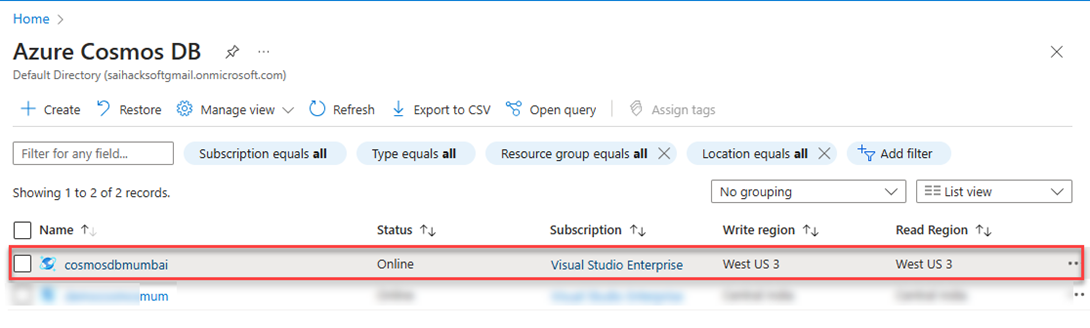 For the demo, I have named it as cosmosdbmumbai